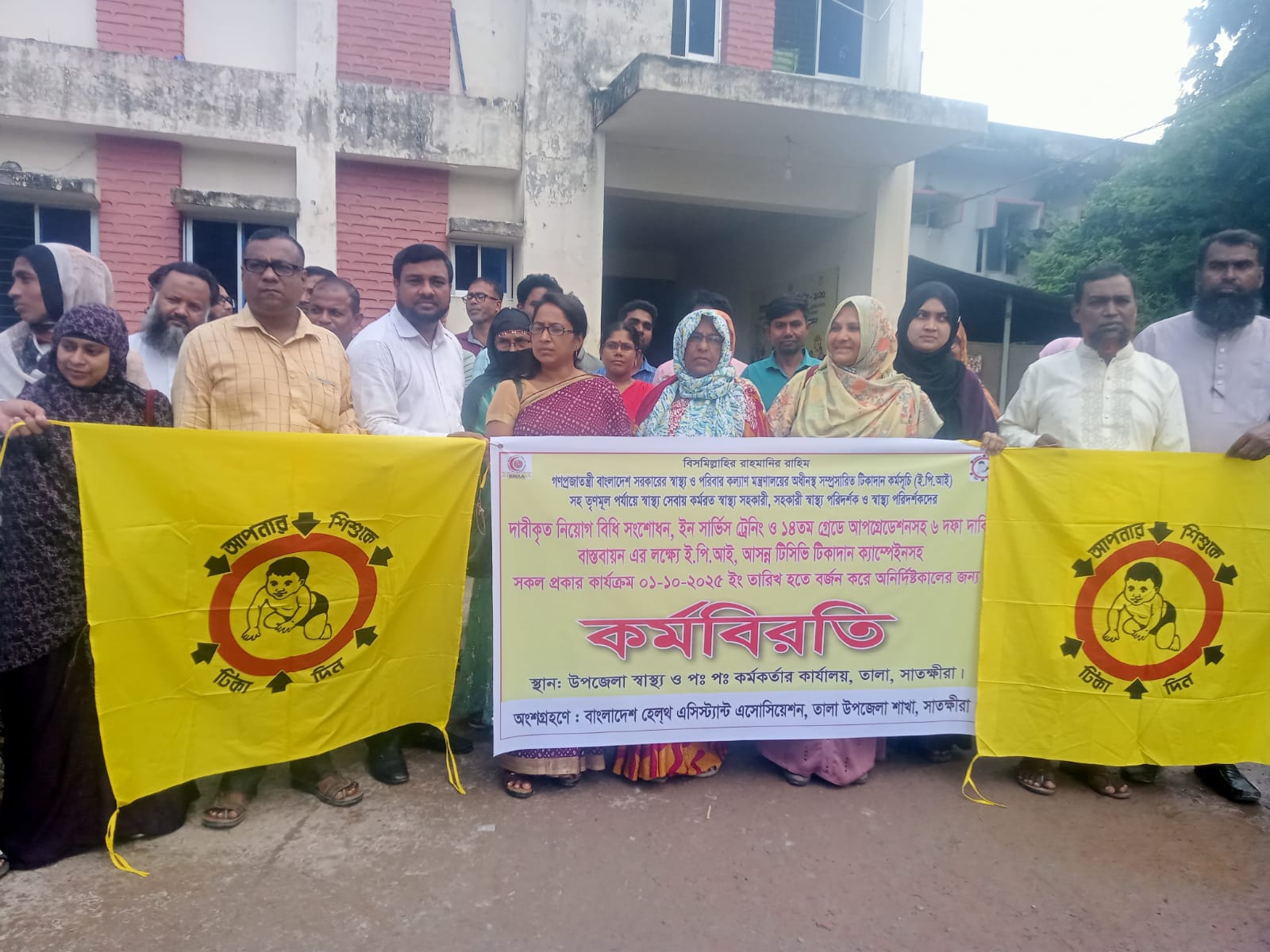 সাতক্ষীরার তালায় স্বাস্থ্য ও পরিবার কল্যাণ মন্ত্রনালয়ের অধীনস্থ সম্প্রসারিত টিকাদান কর্মসুচী (ই,পি,আই) সহ তৃণমূল পর্যায়ে স্বাস্থ্য সেবায় কর্মরত স্বাস্থ্য সহকারী, সহকারী স্বাস্থ্য পরিদর্শক ও স্বাস্থ্য পরিদর্শকদের ৬ দফা দাবি আদায়ের লক্ষ্যে ১ অক্টোবর থেকে অনির্দিষ্টকালের জন্য কর্মরিরতি পালন।