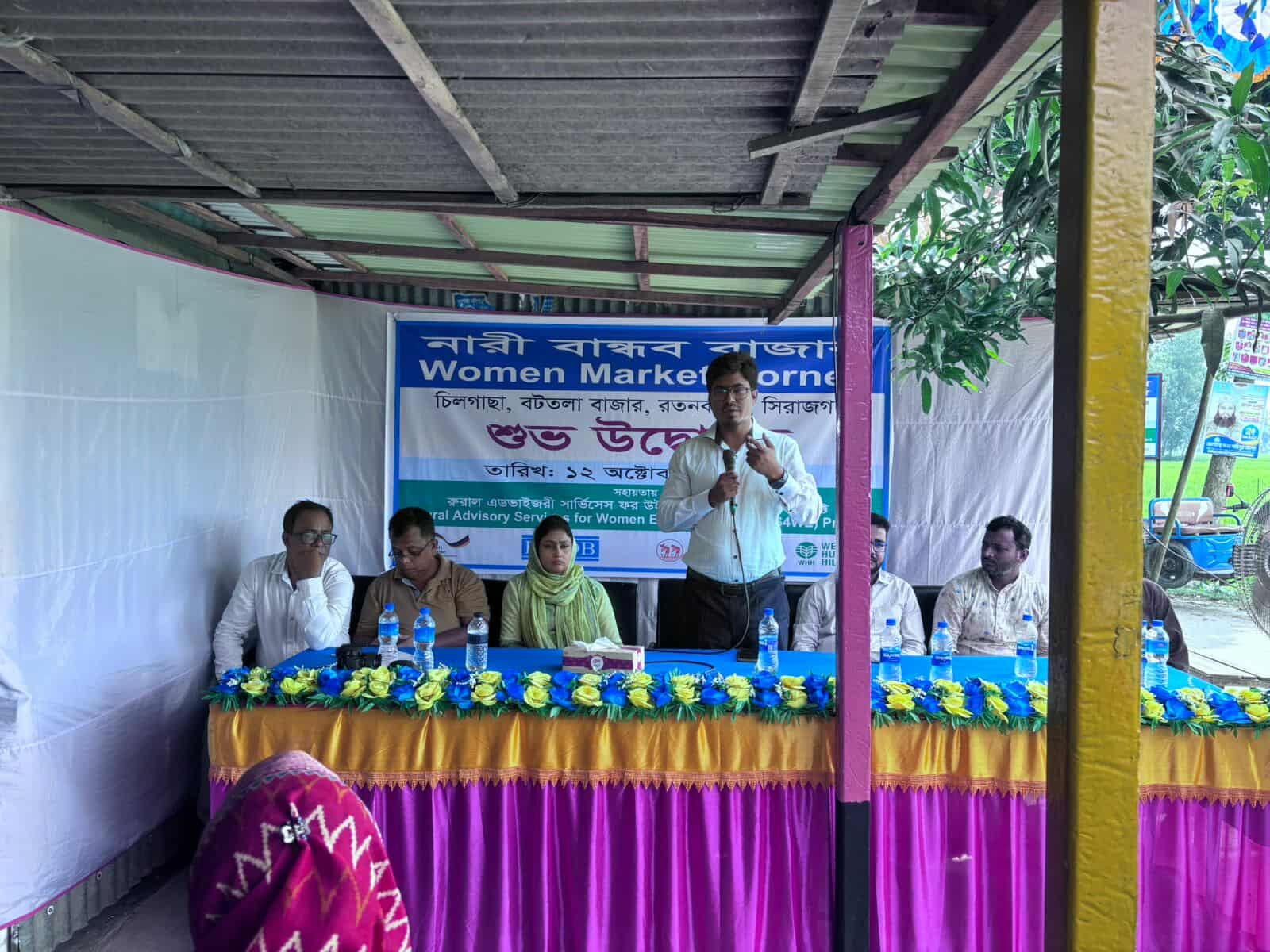 রবিবার (১২ অক্টোবর) সকালে বেসরকারি সংস্থা উত্তরণ, ওয়েলথাঙ্গারহিলফি এবং ফ্রেন্ডস ইন ভিলেজ ডেভেলপমেন্ট বাংলাদেশ এর বাস্তবায়নে সিরাজগঞ্জ সদর উপজেলার রতনকান্দি ইউনিয়নে চিলগাছা, বটতলা বাজার-এ নারী বান্ধব বাজারের উদ্বোধন অনুষ্ঠিত হয়েছে। অনুষ্ঠানে সভাপতিত্ব করেন চিলগাছা বাজার কমিটির সভাপতি মোঃ আব্দুল আলীমফারহাদ। প্রধান অতিথি হিসেবে উপস্থিত ছিলেন মোঃ মেরাজ হোসেন মেজবাহ, ভেটেরিনারি সার্জন, প্রাণিসম্পদ বিভাগ, সিরাজগঞ্জ এবং ভারপ্রাপ্ত প্রশাসক, রতনকান্দি ইউনিয়ন। বিশেষ অতিথি হিসেবে উপস্থিত ছিলেন মোঃ সাইদী রহমান, কৃষি সম্প্রসারণ কর্মকর্তা, সিরাজগঞ্জ এবং ড. ফাতিমা নাসরিন জাহান, কৃষি অর্থনীতি বিশেষজ্ঞ, ওয়েলথাঙ্গারহিলফি (WHH) বাংলাদেশ। অনুষ্ঠানে আরও উপস্থিত ছিলেন মোঃ নুরুল ইসলাম, প্রকল্প সমন্বয়কারী, রুরাল এডভাইজরী সার্ভিস ফর উইমেন এম্পাওয়ারমেন্ট (RAS4WE) প্রকল্প, ফ্রেন্ডস ইন ভিলেজ ডেভেলপমেন্ট বাংলাদেশ (FIVDB); মোঃ সাইদুর রহমান, সিভিল সোসাইটি ও অ্যাডভোকেসি সমন্বয়কারী, উত্তরণ এবং জমিদাতা মোঃ সাজেদুল ইসলাম। এছাড়াও এলাকার গণ্যমান্য ব্যক্তি আব্দুর রউফ তালুকদার, আইনাল হকসহ নারী উদ্যোক্তা, নারী কমিউনিটি সার্ভিস প্রোভাইডার (CSPs) এবং নারী ক্ষুদ্র, ছোট ও মাঝারি উদ্যোক্তা (MSMEs)-রা অনুষ্ঠানে উপস্থিত ছিলেন। উল্লেখ্য, নারী বান্ধব এই বাজারটি রুরাল এডভাইজরী সার্ভিস ফর উইমেন এম্পাওয়ারমেন্ট (RAS4WE) প্রকল্প এর উদ্যোগে এবং ফ্রেন্ডস ইন ভিলেজ ডেভেলপমেন্ট বাংলাদেশ (FIVDB), উত্তরণ ও ওয়েলথাঙ্গারহিলফি (WHH) বাংলাদেশ এর যৌথ বাস্তবায়নে প্রতিষ্ঠিত হয়েছে।