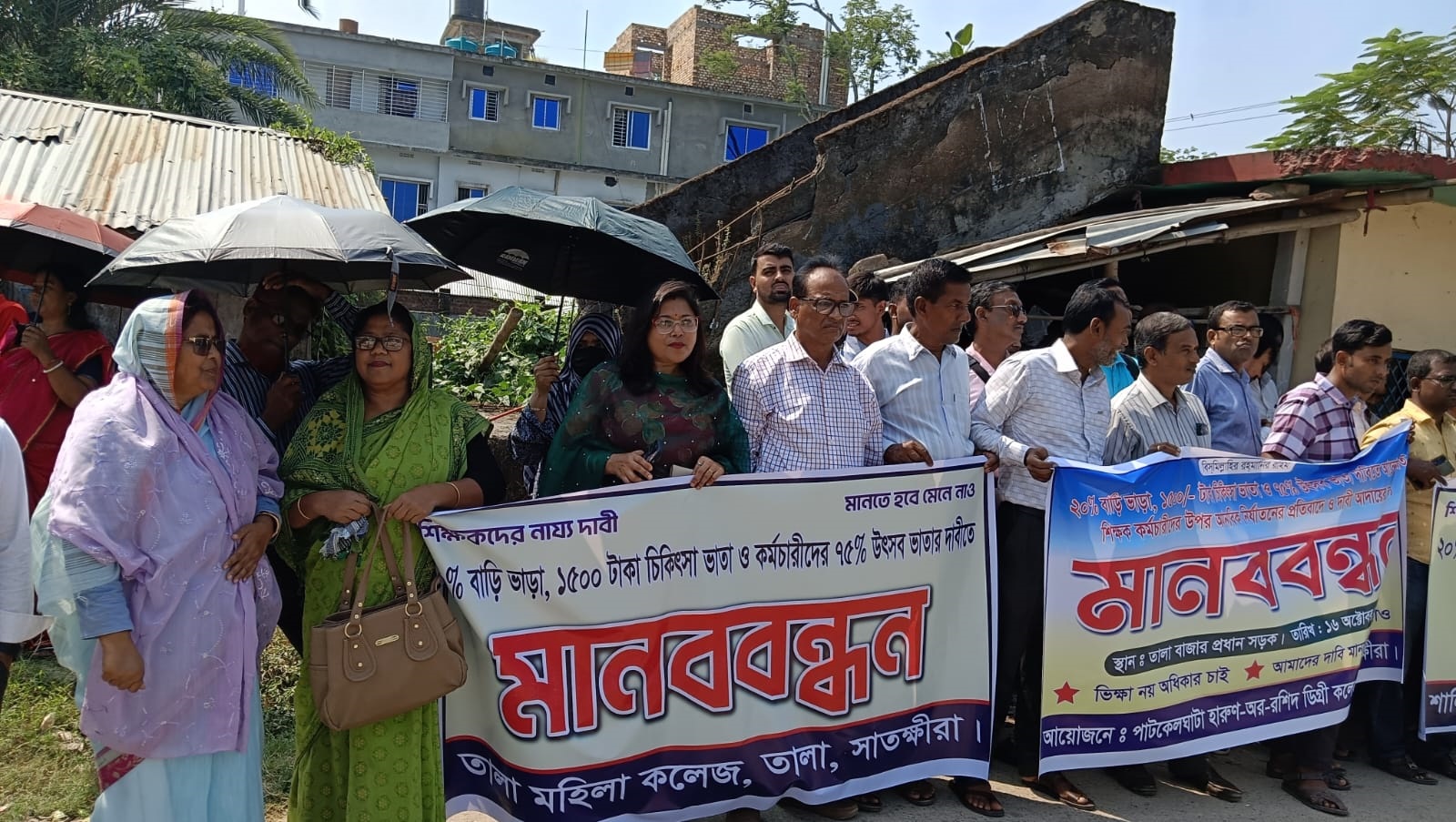 বেসরকারি শিক্ষা প্রতিষ্ঠানের এমপিওভুক্ত শিক্ষক-কর্মচারীদের বেতন বৈষম্য নিরসন, উৎসব ভাতা ও বার্ষিক ইনক্রিমেন্টসহ বিভিন্ন দাবিতে কেন্দ্রীয় কর্মসূচির অংশ হিসেবে বৃহস্পতিবার (১৬ অক্টোবর) সকাল ১০টায় সাতক্ষীরার তালা প্রেসক্লাবের সামনে মানববন্ধন কর্মসূচি পালন করেছেন তালা উপজেলা এমপিওভুক্ত শিক্ষকবৃন্দ।