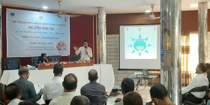 সভায় বাংলাদেশে গ্রাম আদালত সক্রিয়করণ (৩য় পর্যায়) প্রকল্পের ডিস্ট্রিক ম্যানেজার মো: হাফিজুর রহমান মাল্টিমিডিয়ার মাধ্যমে জেলায় সাতটি উপজেলার ইউনিয়ন ভিত্তিক মামলা গ্রহনের চিত্র তুলে ধরেন। তিনি গ্রাম আদালতের বিচার প্রক্রিয়া, কার্যক্রমের অগ্রগতি, মামলার নথি প্রস্তুত ও রেজিস্টারসমূহের ব্যবহারসহ বিভিন্ন বিষয় উপস্থাপন করেন।