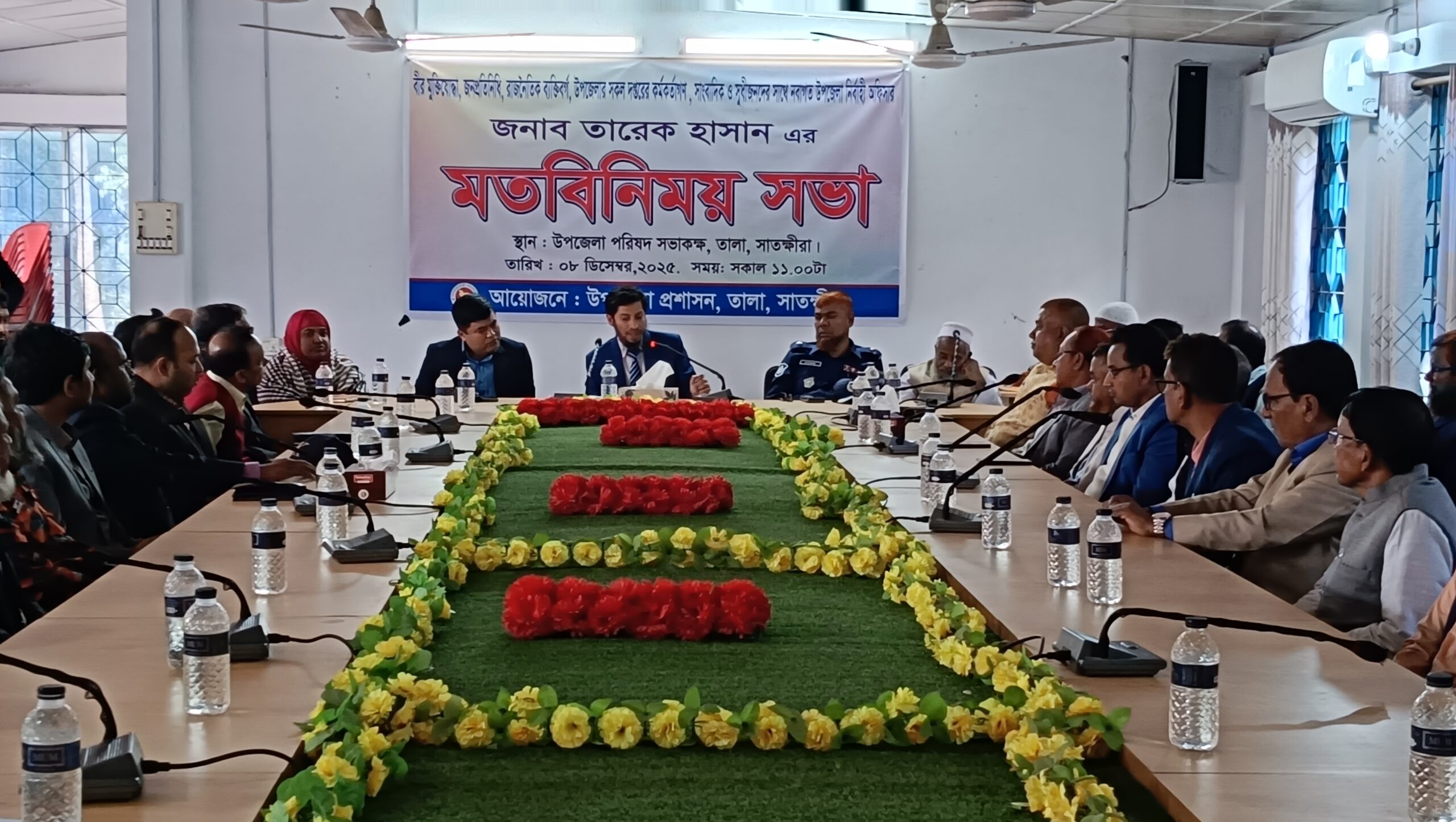 তালায় সুধীজনদের সঙ্গে নবাগত উপজেলা নির্বাহী কর্মকর্তা (ইউএনও) তাকে হাসানের মতবিনিময় সভা অনুষ্ঠিত হয়েছে। সোমবার (৮ ডিসেম্বর) বেলা ১১টায় উপজেলা প্রশাসনের আয়োজনে তালা উপজেলা পরিষদের সভাকক্ষে মতবিনিময় করেন, তালা উপজেলার নবাগত নির্বাহী কর্মকর্তা ও উপজেলা পরিষদের প্রশাসক তারেক হাসান। উপজেলা সহকারী কমিশনার (ভূমি) রাহাত খানের সঞ্চালনায় সভায় বক্তব্য রাখেন তালা থানার অফিসার ইনচার্জ (তদন্ত) মো. সাখাওয়াত হোসেন, সাতক্ষীরা জেলা জামায়াতের নায়েবে আমীর ডা. মাহমুদুল হক, তালা উপজেলা বিএনপির সভাপতি মৃণাল কান্তি রায়, সাধারণ সম্পাদক অধ্যক্ষ সেখ শফিকুল ইসলাম, তালা উপজেলা জামায়াতের আমীর মাওলানা মফিদুল ইসলাম, মুক্তিযোদ্ধা মোঃ মফিজ উদ্দীন, আলাউদ্দীন জোয়ার্দ্দার, জালালপুর ইউপি চেয়ারম্যান এম মফিজুল হক লিটু, ধানদিয়া ইউপি চেয়ারম্যান জাহাঙ্গীর আলম, ইসলামকাটি ইউপি চেয়ারম্যান গোলাম ফারুক, শহীদ মুক্তিযোদ্ধা মহাবিদ্যালয়ের অধ্যক্ষ এনামুল ইসলাম, উপজেলা দুর্নীতি প্রতিরোধ কমিটির সাধারণ সম্পাদক ও প্রধান শিক্ষক গাজী জাহিদুর রহমান, সাবেক অধ্যক্ষ মোঃ আব্দুর রহমান, তালা প্রেসক্লাবের সভাপতি এস এম হাকিম, সাধারণ সম্পাদক ফারুক হোসেন,পাটকেলঘাটা প্রেসক্লাবের সভাপতি আব্দুল মোমিন, সাংবাদিক নজরুল ইসলাম, উপজেলা নাগরিক কমিটির সাধারণ সম্পাদক শফিকুল ইসলাম, যুবদলের আহবায়ক মির্জা আতিয়ার রহমান, যুগ্ম আহŸায়ক সাইদুর রহমান সাঈদ, ঠিকাদার মোঃ ময়েজ উদ্দীন, নাসিরুদ্দীন নাহিদ, বৈষম্যবিরোধী ছাত্র আন্দোলনের নেতা আব্দুল কাদের প্রমুখ।